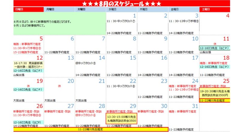 緒川先生の8月の鑑定は電話のみ、また合計7時間のみとなります。