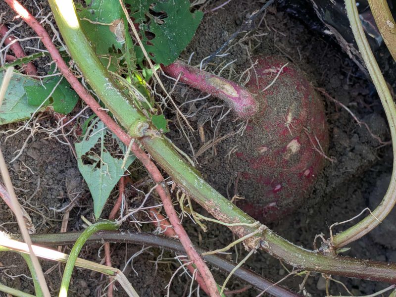 金時・安納芋・紅あずま・紅はるかを植えたけれど、どれがどれやら・・・。