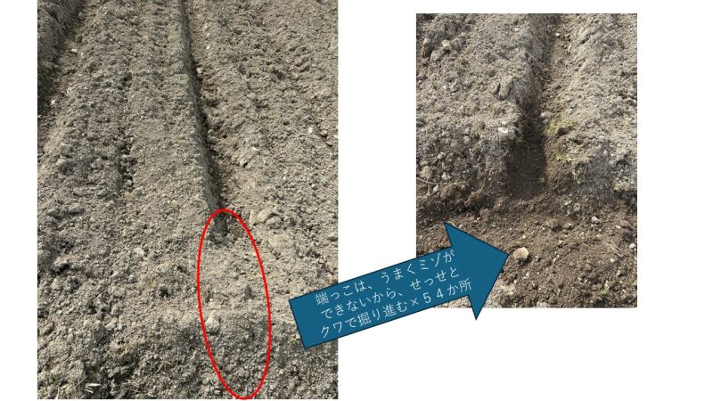 そんなわけで50カ所以上あるミゾ掘りスタート、こればっかり格闘す・・・。